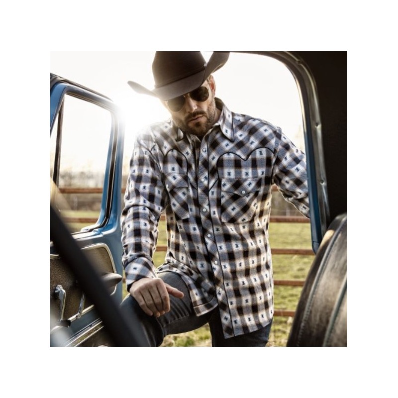 Chemise western pour homme, avec motif à carreaux marqué dans des tons sobres, et de petits détails tissés. Le joug western typique, les poches poitrine plaquées et les poignets western avec 6 boutons pressions marbrés, donnent un style cow-boy authentique.