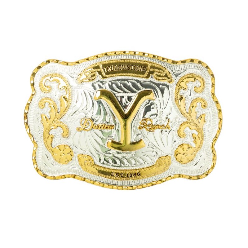 Boucle de ceinture Western Yellowstone avec application dorée brillante en relief représentant le logo Yellowstone, des motifs floraux et l'inscription Dutton Ranch.