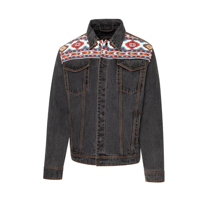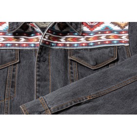 Veste pour homme, courte, en jean western avec doublure intérieur et col en imitation peau de mouton chaude. Epaulettes au motif aztèque.