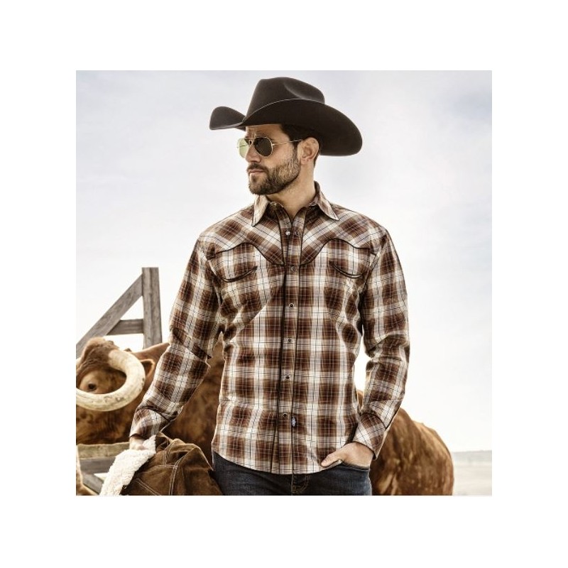 Chemise western pour homme, avec motif à carreaux marqué dans des tons chauds de brun et beige. Les poignets western avec 6 boutons pressions, donnent un style cow-boy authentique.