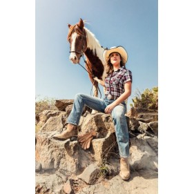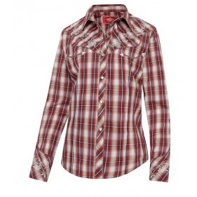 Blouse western pour dame, avec motif à carreaux marqué dans des tons sobres, avec de petits détails tissés. Le joug western typique, les poches poitrine plaquées et les boutons pression marbrés apportent une touche cowgirl authentique.